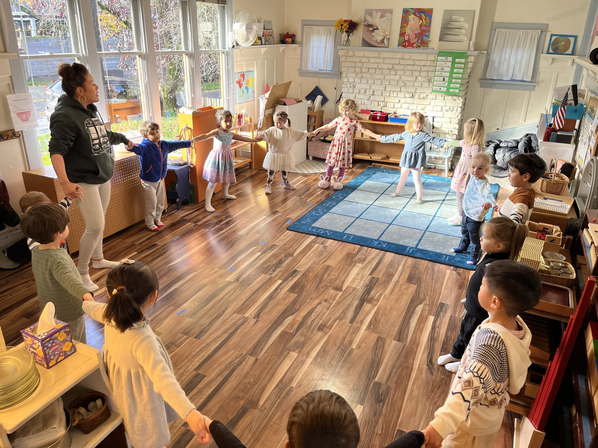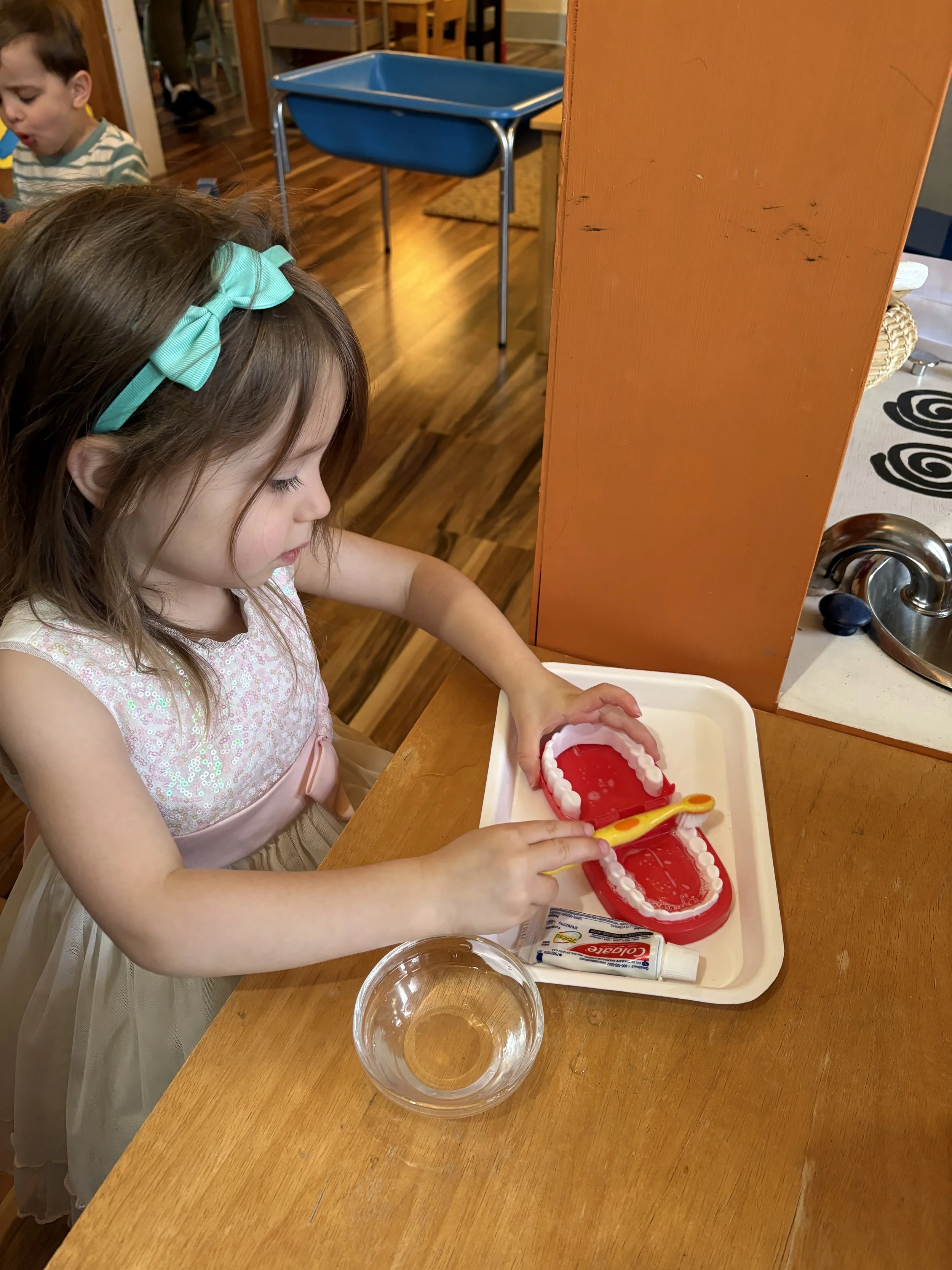 Children work independently, in small groups and as a class throughout the day. Teachers monitor progress and help fill in gaps, so each child is building on the next skill needed to prepare them for kindergarten and beyond. Our hands on Montessori work is coupled with dramatic play, cooperative play and monthly thematic units.